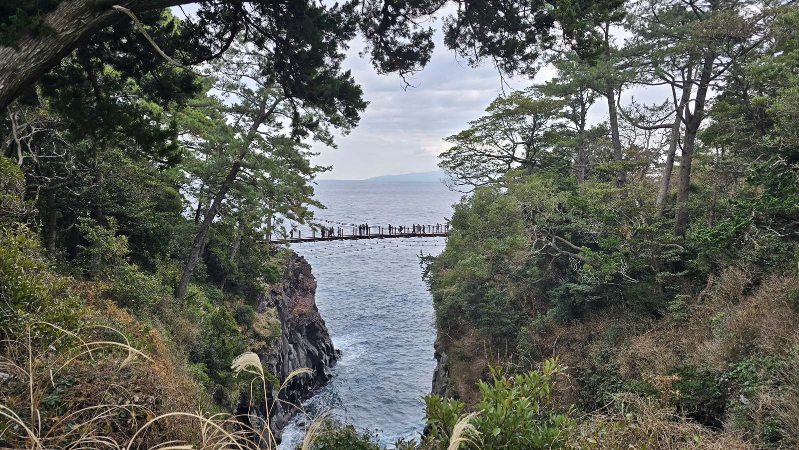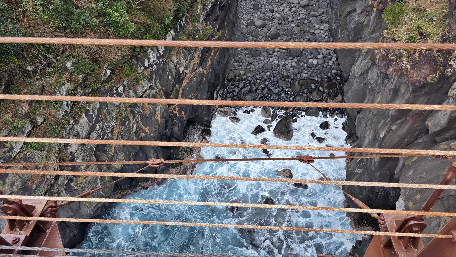 走在懸空的門脇吊橋上,腳下就是洶湧的海浪,十分的刺激