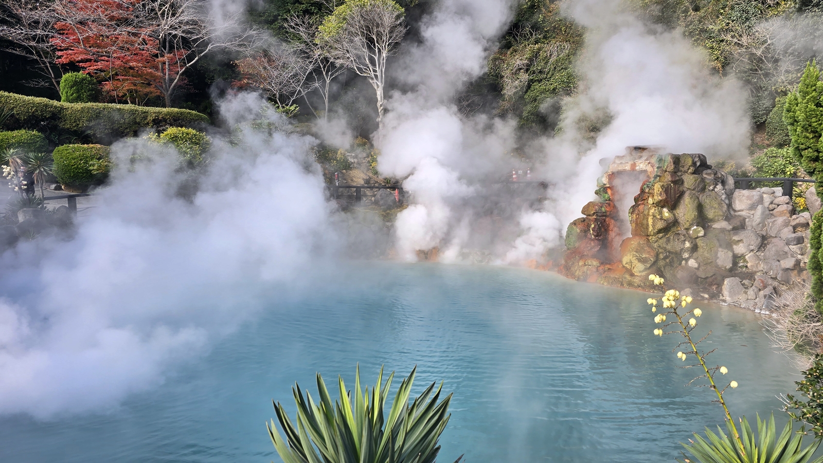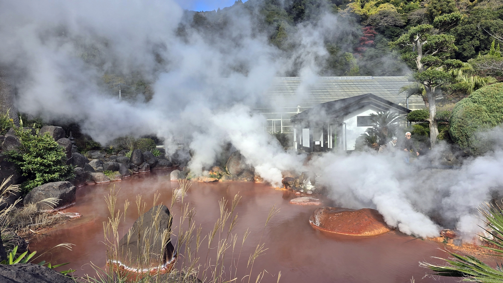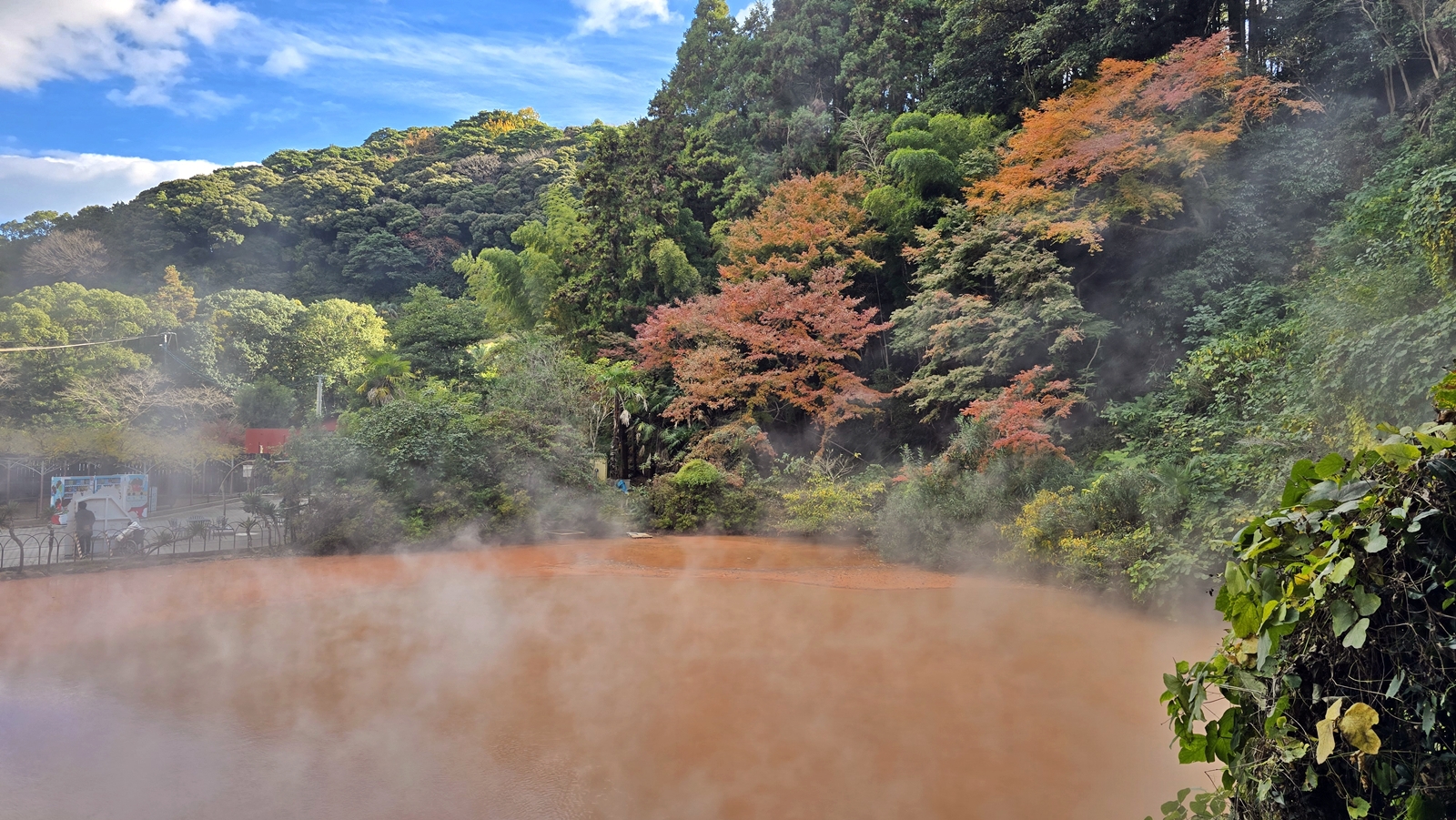 池水看起來是血紅色的,主要是因為水中含許多氧化鐵 所以呈現這種顏色,水溫約78度,接觸到冷空氣後水面上產生了大量霧氣,看起來煙霧裊裊 更加有靈氣