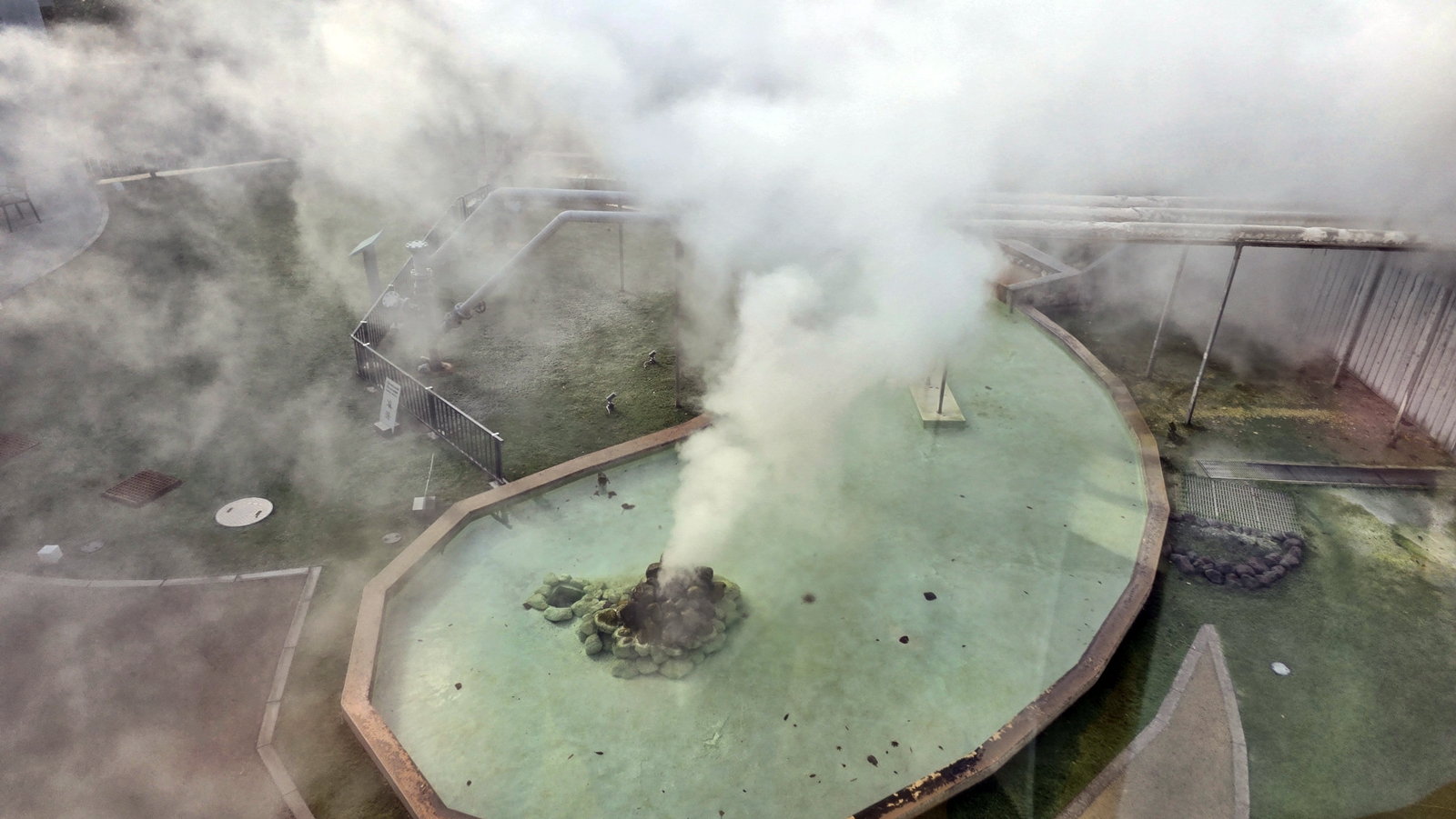 和海地獄一樣,這邊也有個淺藍色的溫泉池,池水的溫度高達98度,主要的成分是二氧化矽