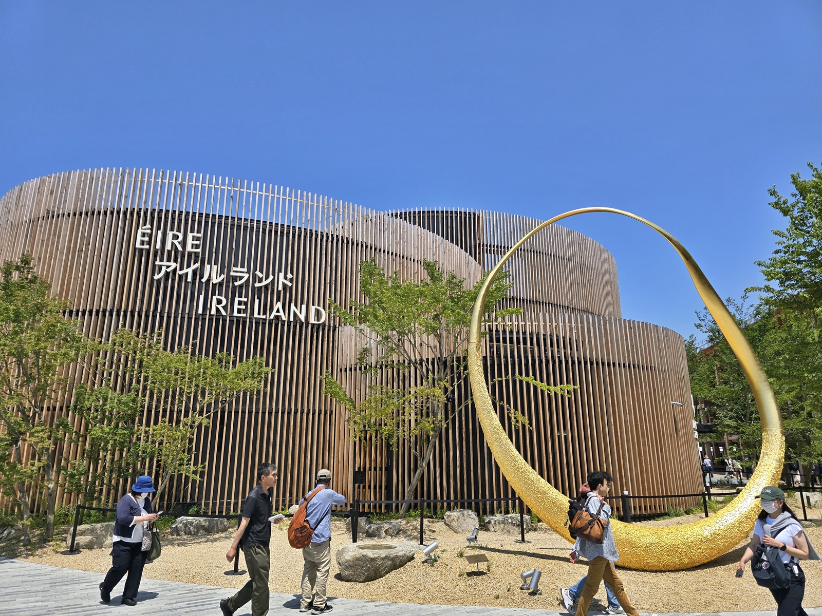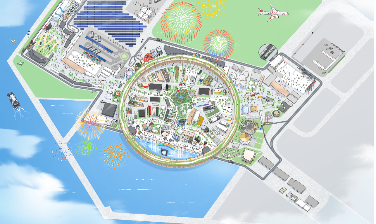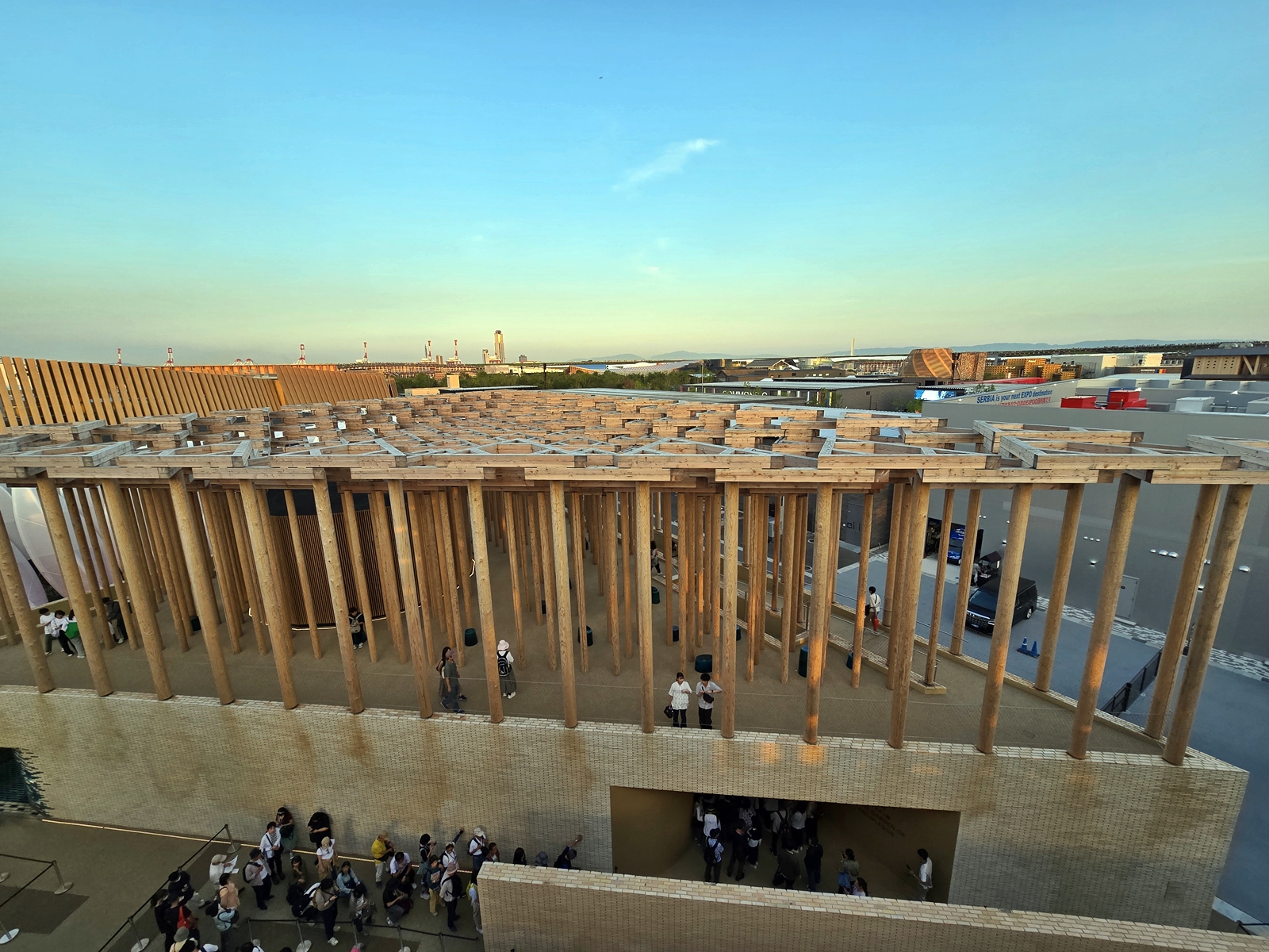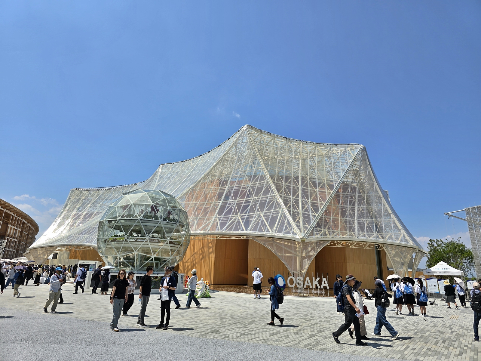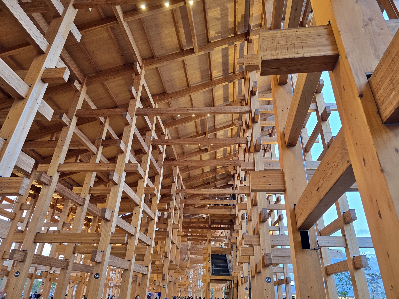 大屋根是整個世博會的核心標誌性建築,由建築師藤本壯介設計。它是一個周長約2公里、面積達6萬平方公尺的巨大環狀木造迴廊,被金氏世界紀錄認證為世界上最大的木造建築。