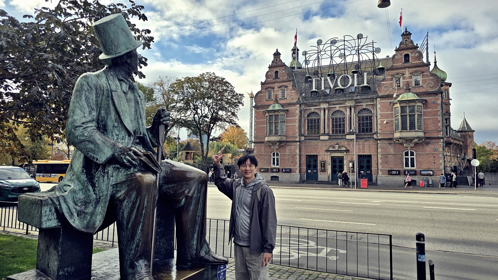 Hans Christian Andersen,是丹麥最著名的童話作家,這座銅像紀念它對整個丹麥的影響。 最經典的畫面就是它看著馬路對面的Tivoli Gardens,是許多遊客來到這裡排隊打卡的景點