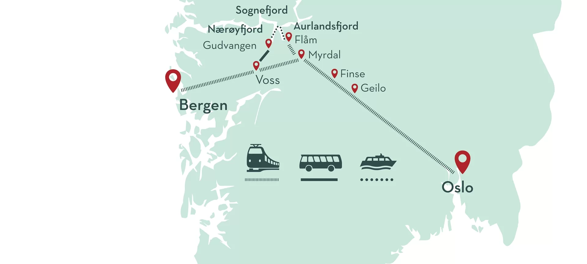 Oslo 奧斯陸 – [火車-挪威國鐵 5.5hr ] → Myrdal 米達爾 –[Flåm 高山鐵路 1hr ] → Flåm 弗拉姆- [渡輪 2hr ] → Nærøyfjord 那柔伊峽灣→ Gudvangen 古德凡根 – 巴士(1.5hr)] → Voss 佛斯 – [火車-挪威國鐵 1.5 hr] → Bergen 卑爾根