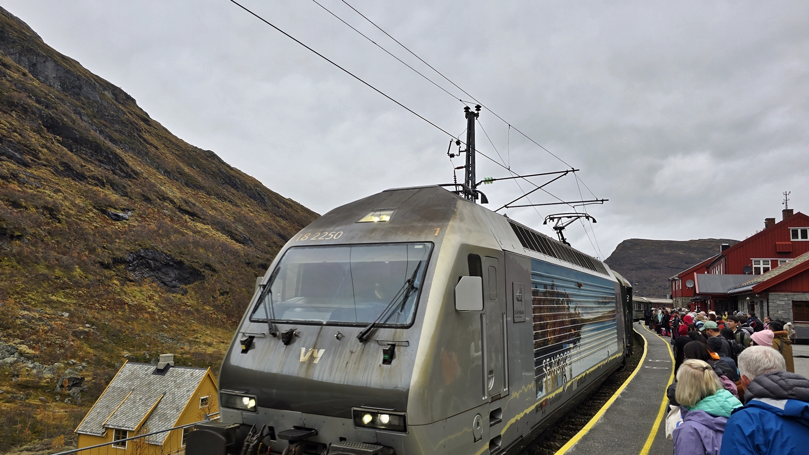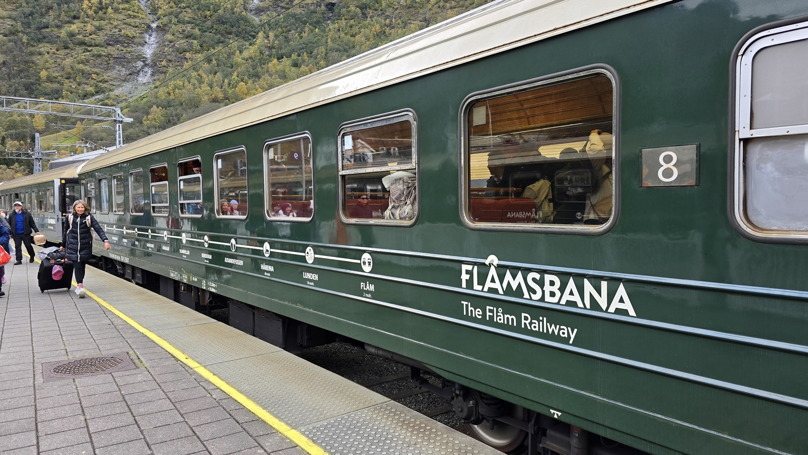 第二段:Myrdal → Flåm。 直接到隔壁月台轉乘 Flåmsbana 登山火車