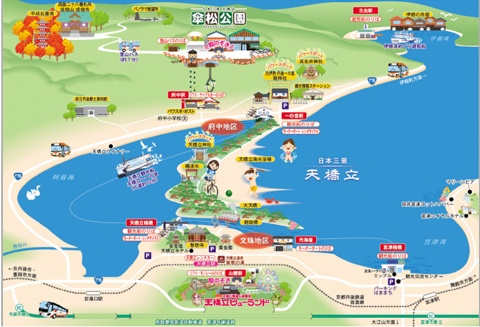 知名欣賞沙洲的景點有二: 天橋立View Land、傘松公園